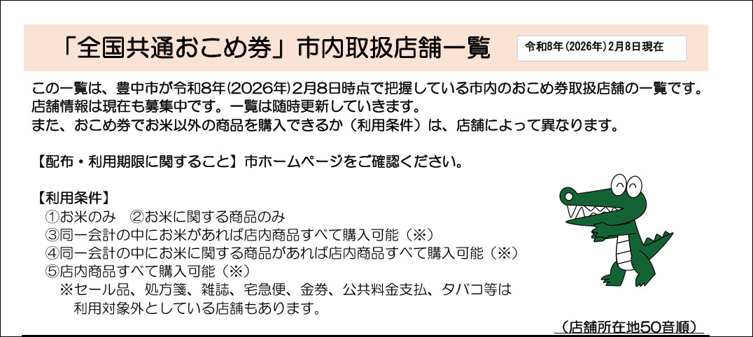 また、豊中市のホームページには「取扱店舗一覧」とともに、「おこめ券でお米以外の商品が購入できるか」といった購入条件についてもまとめられているので(随時更新)