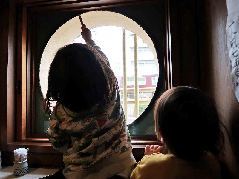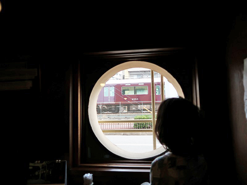 待ち時間も、子どもは丸窓から阪急電鉄を眺めて楽しそうだし