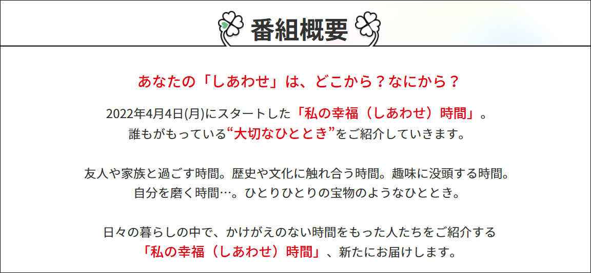 『わたしの幸福時間』は、日々の暮らしの中で誰もがもっている“大切なひととき”を紹介する番組。