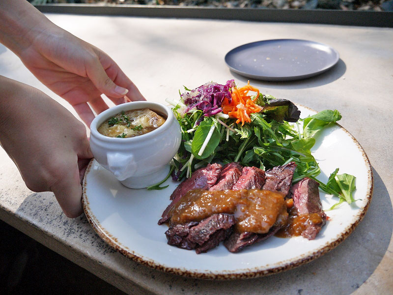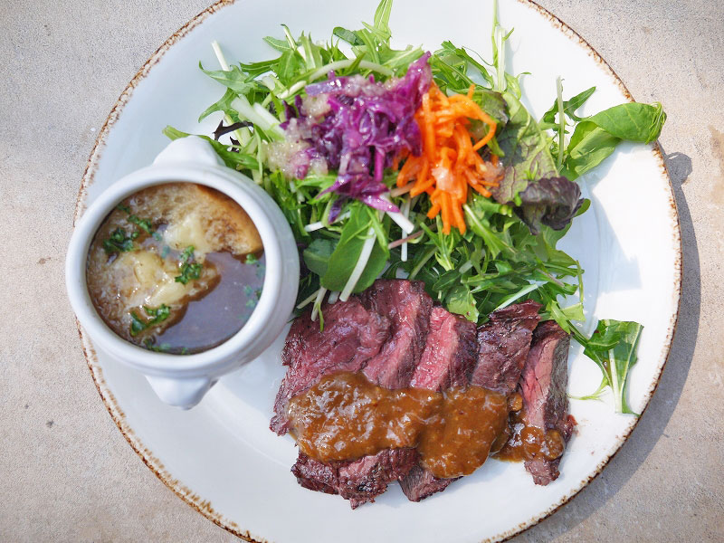 ・・・と感動していると、注文したランチ「炭火焼き牛ハラミステーキ&オニオングラタンスープ」がやってきましたよ。