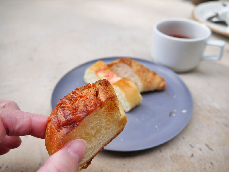 「明太子たっぷりもちもち塩パン」も、ソルビバとのコラボパン。明太子のピリッと感と塩っけがクセになる~。