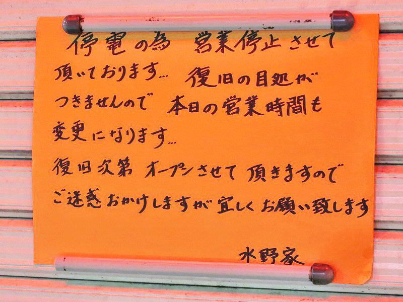 お声がけしたところ「19日は営業できるものの、電源の復旧はまだ一部のみなんです」とおっしゃっていました。→急な対応に追われて大変な1日だったと思います、本当にお疲れさまです