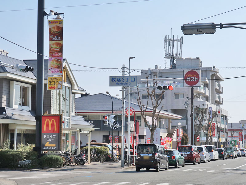 牧落交差点から北へ進んだところの右手にあります。※画像は奥が牧落交差点方面
