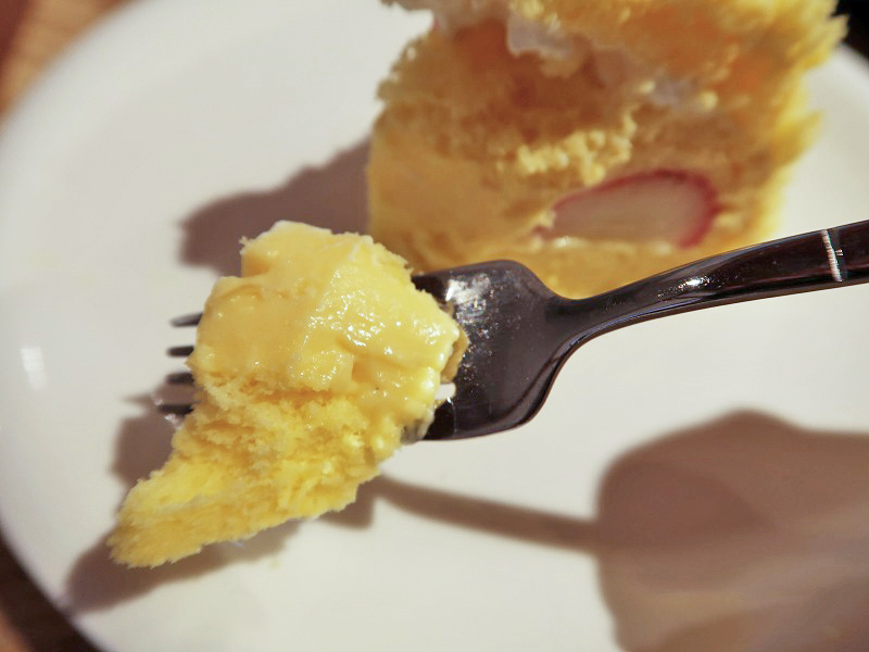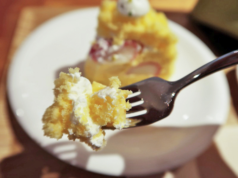 ふわふわのミモザの花に見立てたケーキ、断面に苺が見えていてかわいい。
