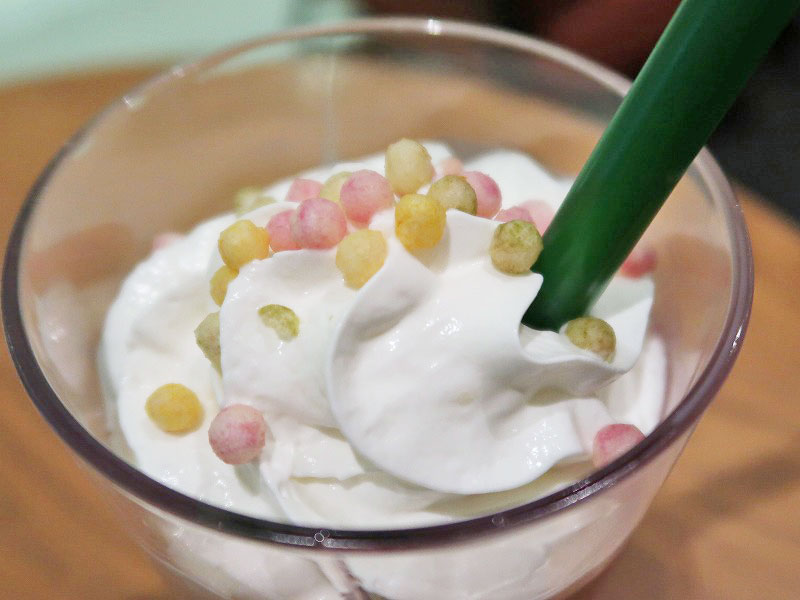 上に乗っているのは「おいり」という香川の伝統的な祝い菓子で、あられの一種。パフのようなサクサクの食感で、クリームと良く合います。
