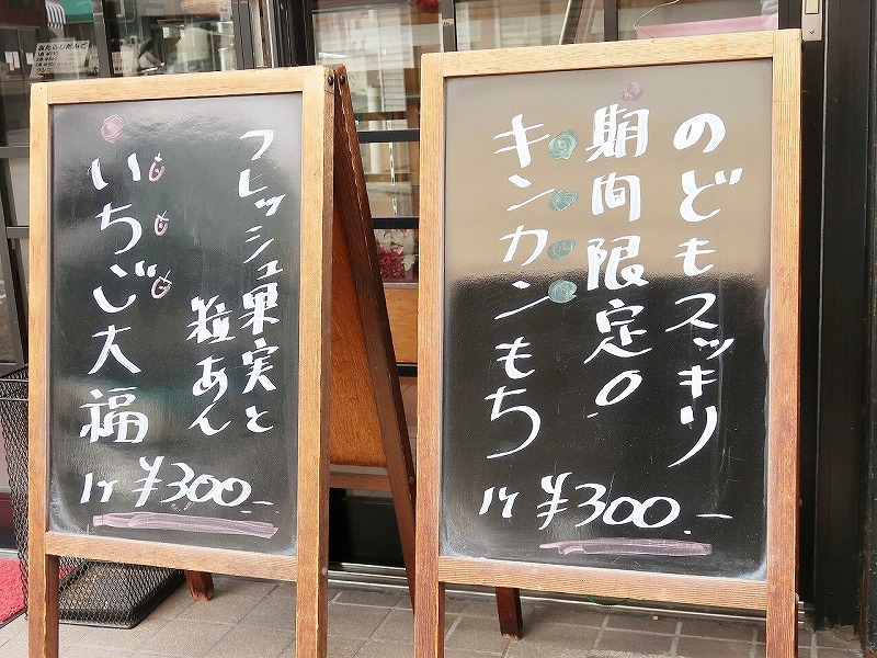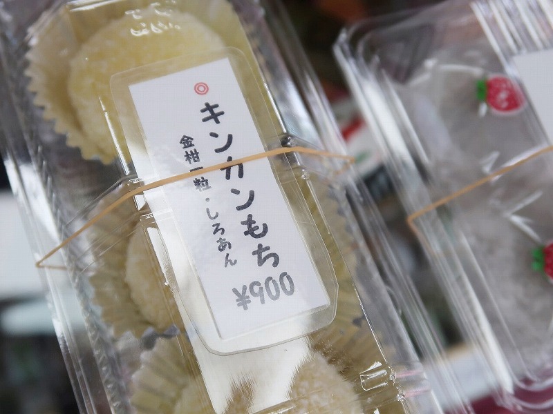 今回はオモテの看板で告知されていた期間限定の「キンカンもち」に