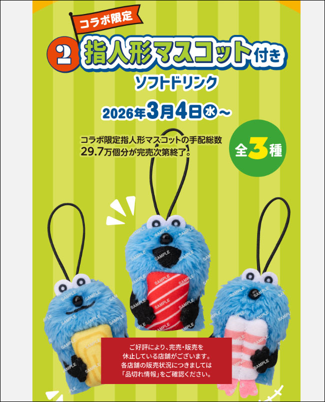 なお「指人形マスコット付きソフトドリンク」は、すでに終了している店舗もありますので、行かれる際は気を付けて下さいね。(すごい人気だ!)