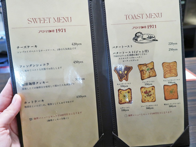 フードメニューはケーキなどのほかに、トーストのメニューが豊富。