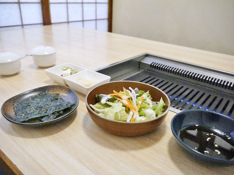しばらくすると、まずは「サラダ」「韓国のり」「小鉢二品」が運ばれてきて・・・