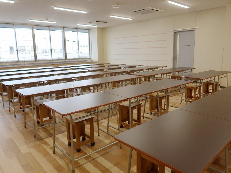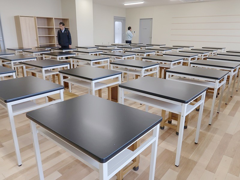 技術室にも大きな机。彫刻刀でも傷がつきにくそうな天板素材に見えました。