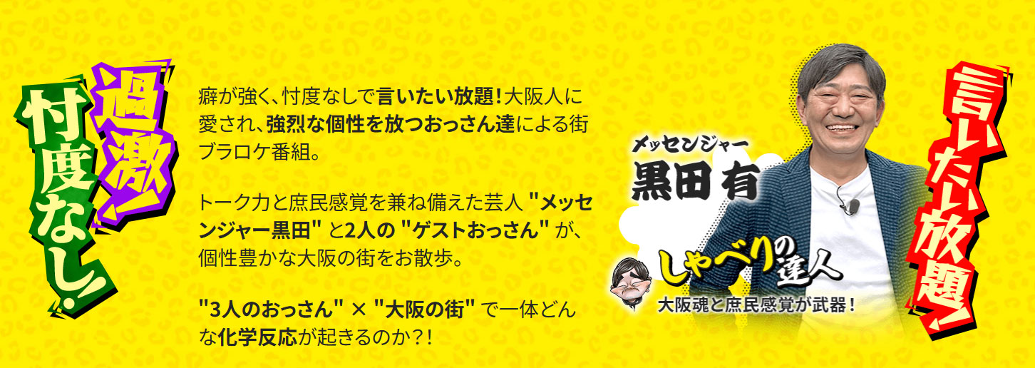 『大阪おっさんぽ』はメッセンジャー黒田さんと、2人の "ゲストおっさん" が個性豊かな大阪の街をお散歩する「街ブラ番組」。
