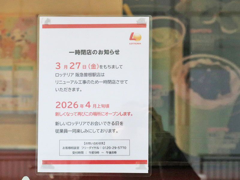 曽根東町にある「ロッテリア 阪急曽根駅店」が一時閉店するようです。