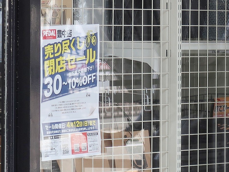 中桜塚にある自転車屋さん「ペダル 豊中店」が閉店するようです。