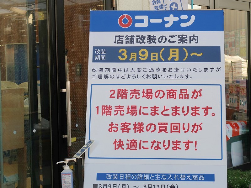 島江町にあるコーナンが改装工事中で、2階にあったものが全て1階に集約されて2階が空になってた