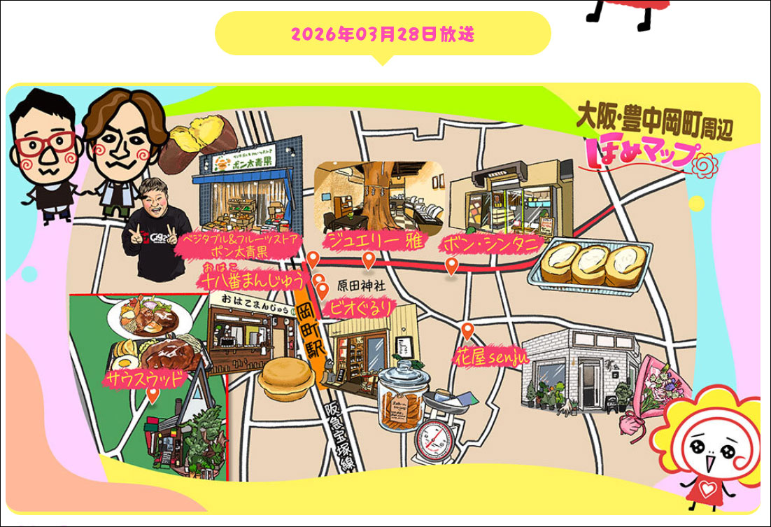 3月28日(土)MBSの番組『土曜のあさはほめるちゃん』で岡町駅近辺が映っていましたよ。