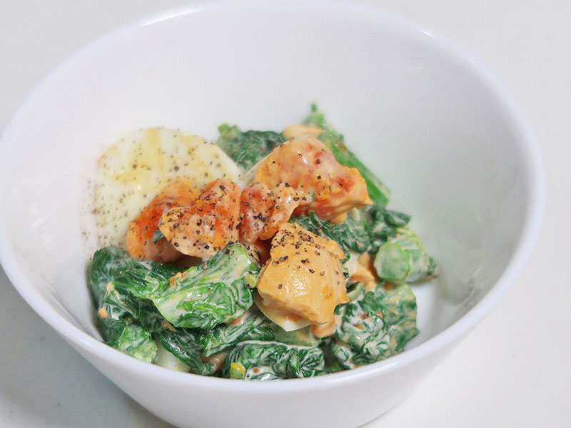 と言っても、ゆで卵と塩ゆでした「なばな」をマヨネーズであえるだけ(かんたーん!)。