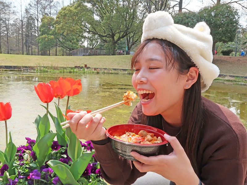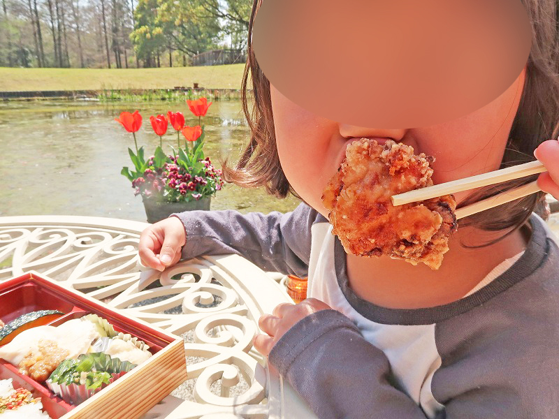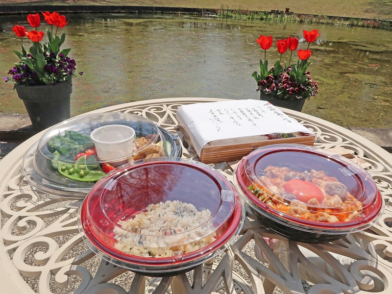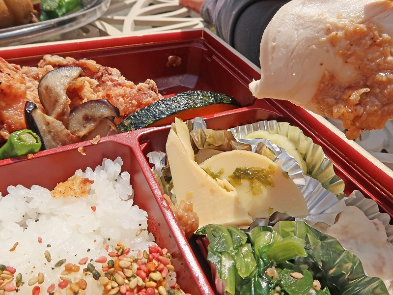 しっとりした発酵蒸し鶏の下にたけのこが隠れていたりと、春を感じるお花見にぴったりのお弁当でした。