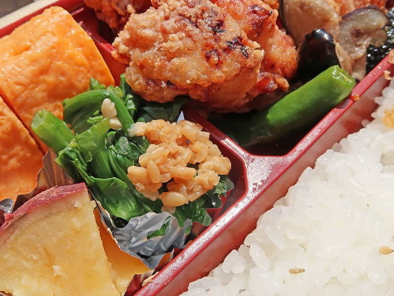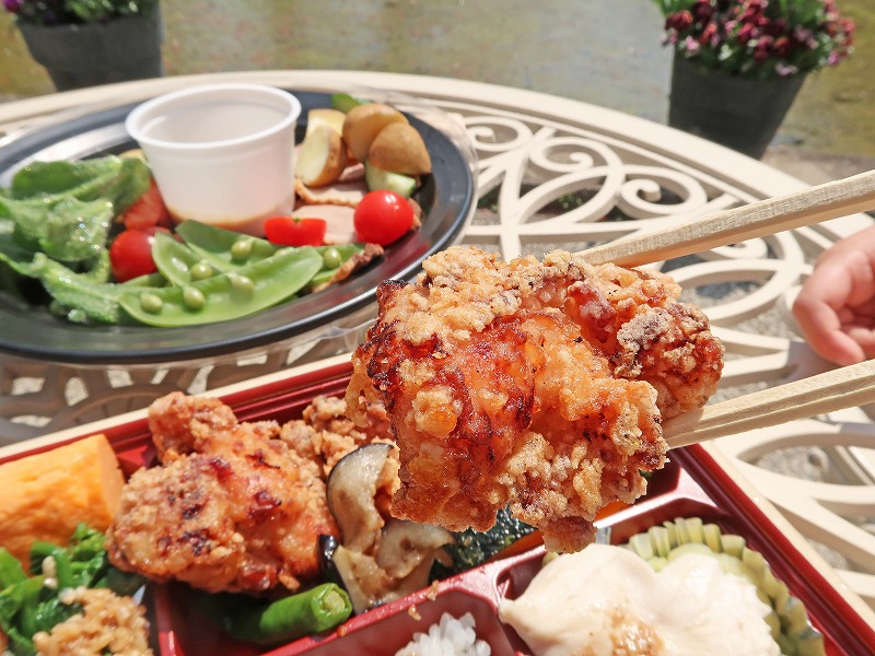 「塩麹唐揚げ弁当」と、華やかでヘルシーな「鴨ロースとバーニャカウダ」。