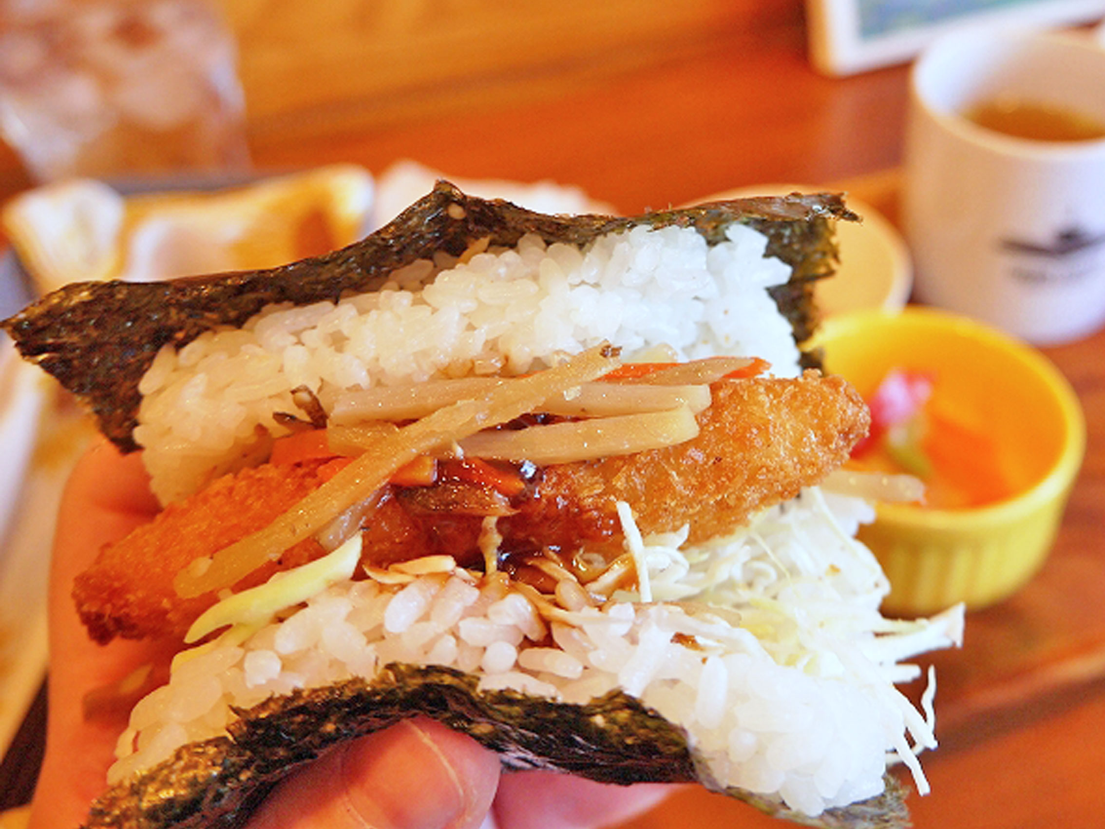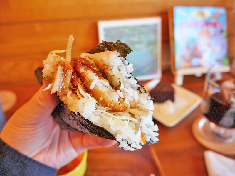 わたしがチョイスしたおにぎりサンドは「のり弁サンド」。キャベツ、白身魚のフライ、ごぼうのきんぴらが挟んでありましたよ。