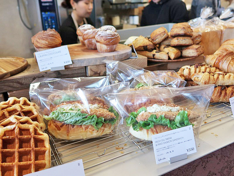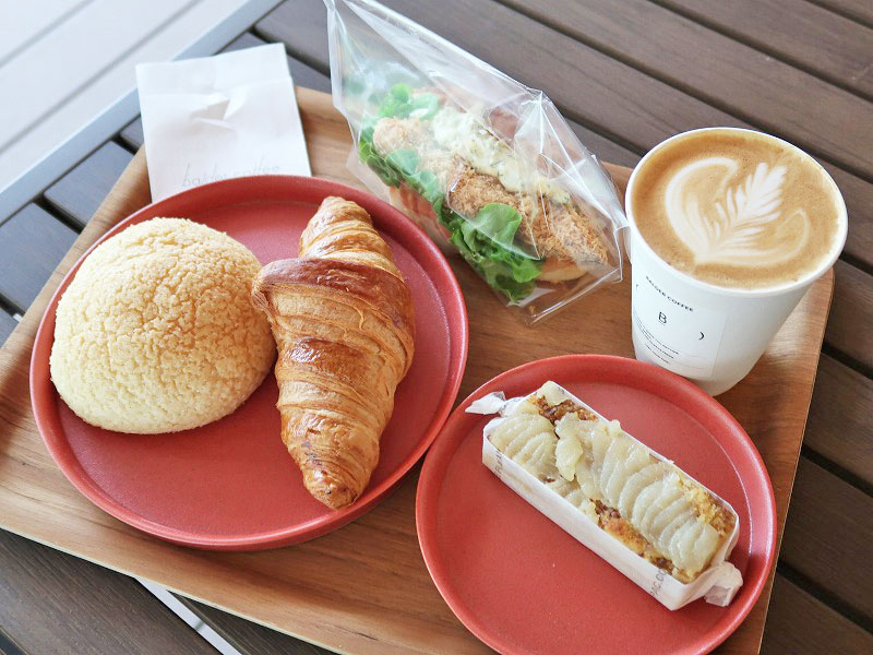 今回購入したのは「メロンパン」「クロワッサン」「フィッシュディルのタルタル&サーモンフライ」「洋ナシのタルト」そして「カフェラテ」です。