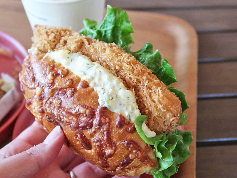 ちょっと甘めのチーズのパンに、シャケのフライが挟まっています。玉ねぎたっぷりのタルタルが好みのお味。