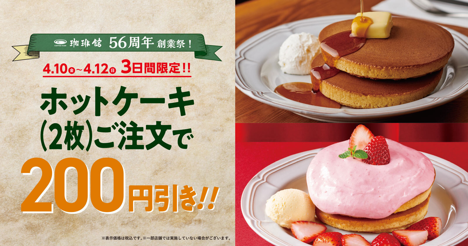 創業56周年の感謝を込めて、3日間限定でホットケーキが200円引きになるそうです。