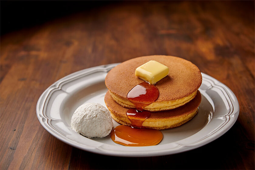 オーダーを受けてから専用の銅板で1枚1枚丁寧に手焼きするホットケーキは、外はカリッと香ばしく、中はふっくらしっとり。懐かしい味をお得に楽しめますよ。
