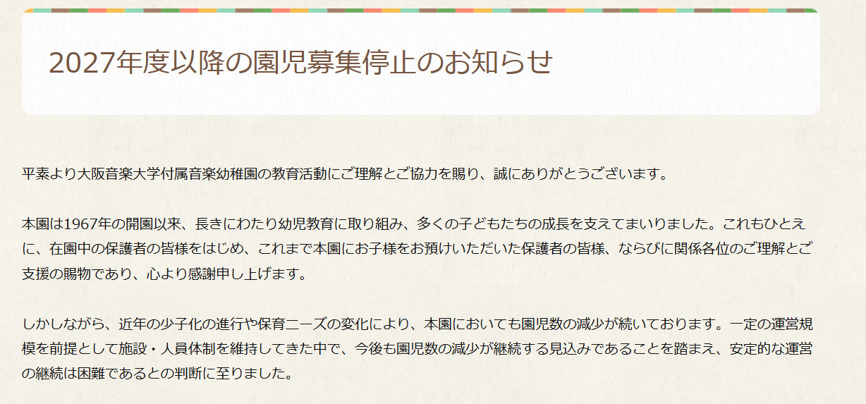 そちらによると2027年度以降の園児募集を停止し、2028年度末(2029年3月末)をもって閉園されるそうです。