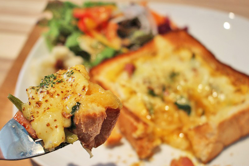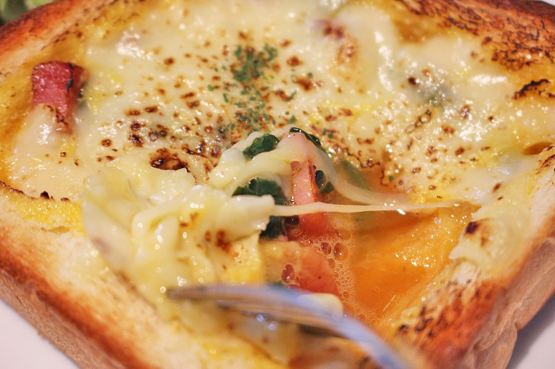 とろけるチーズに、塩気のきいたベーコンと、卵液がしみ込んだパンが絡んでメチャうまー!!
