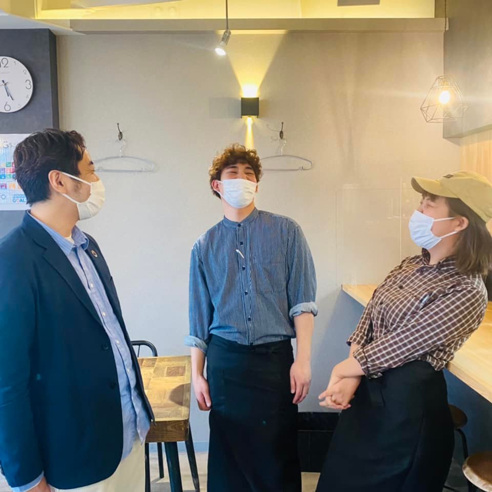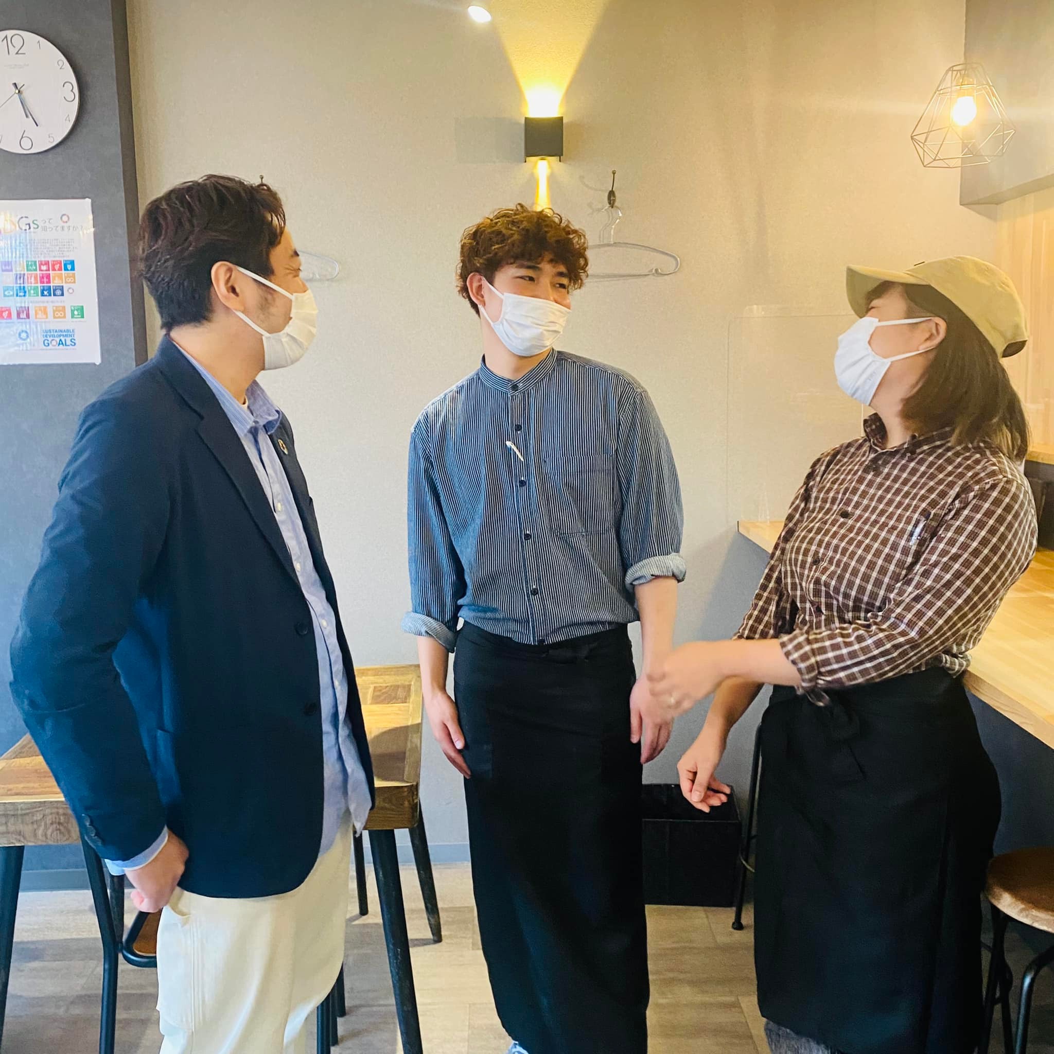 左右がオーナーご夫妻杉本さん、真ん中は「お野菜プリン」の生みの親、曽根店店長のあきらさんです。