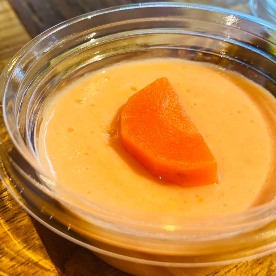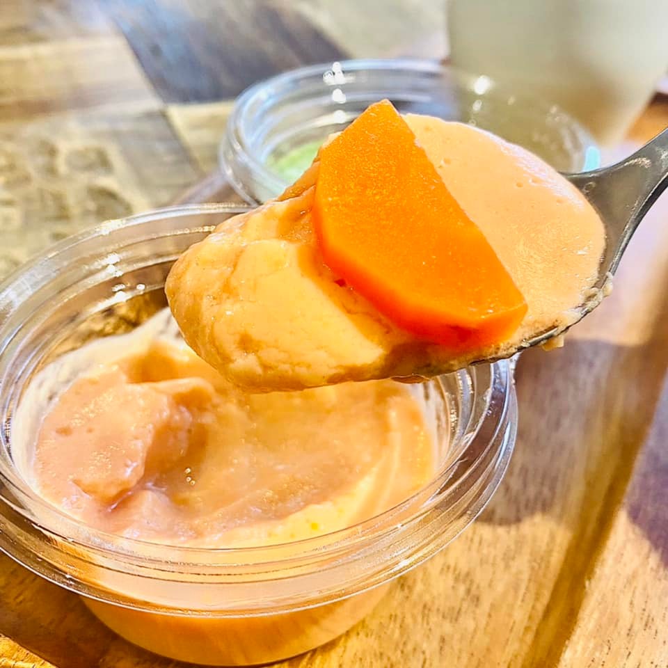 甘さがほんのり。種類によっては三温糖を使うこともあるそうですが、基本的にはお野菜本来の甘みを生かして作られているんですって。プリンでいうと”ふわとろ系”、噛む力は要りません。