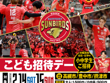 2026年01月17日15歳以下は「無料」で試合観戦ができちゃうんだって/バレーボールチーム「サントリーサンバーズ大阪」の「市民招待デー」のチケット販売がスタートしてる イベント イベント 15歳以下は「無料」で試合観戦ができちゃうんだって/バレーボールチーム「サントリーサンバーズ大阪」の「市民招待デー」のチケット販売がスタートしてる