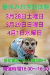 ![]() | 春休み動物お世話体験 @アニマルカフェほっこり空間あしびなぁ(〜3/29) |