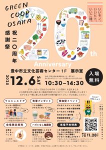 ![]() | イイモノ、いいヒト、いいご縁。祝20周年グリーンコープおおさか感謝祭 @文化芸術センター展示室 |
