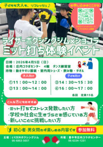 ![]() | ライザーボクシングジム×ショコラ ミット内体験イベント @庄内コラボ |